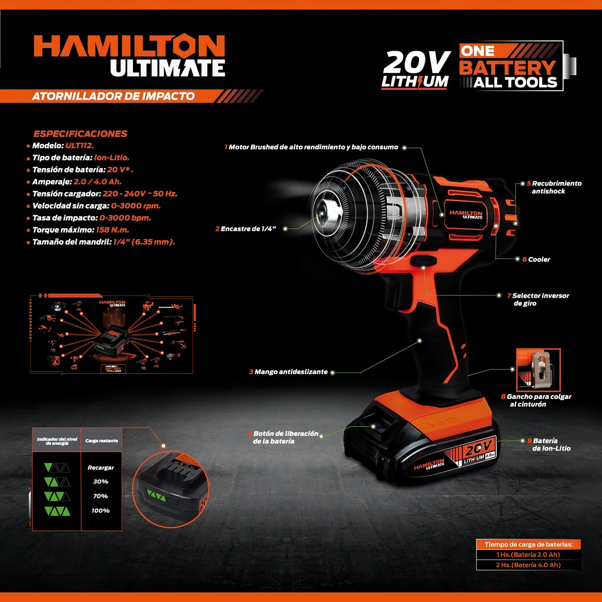 El atornillador-destornillador de impacto inalámbrico Hamilton Ultimate ULT112 es una máquina profesional de alta eficiencia especializada en trabajar con puntas atornilladoras encastre ¼».