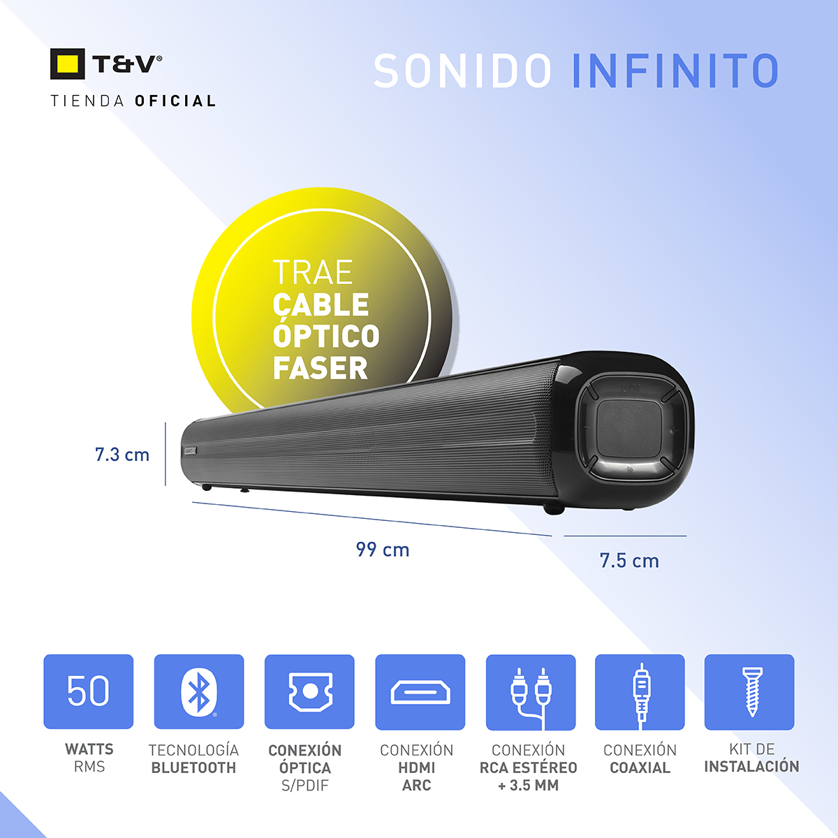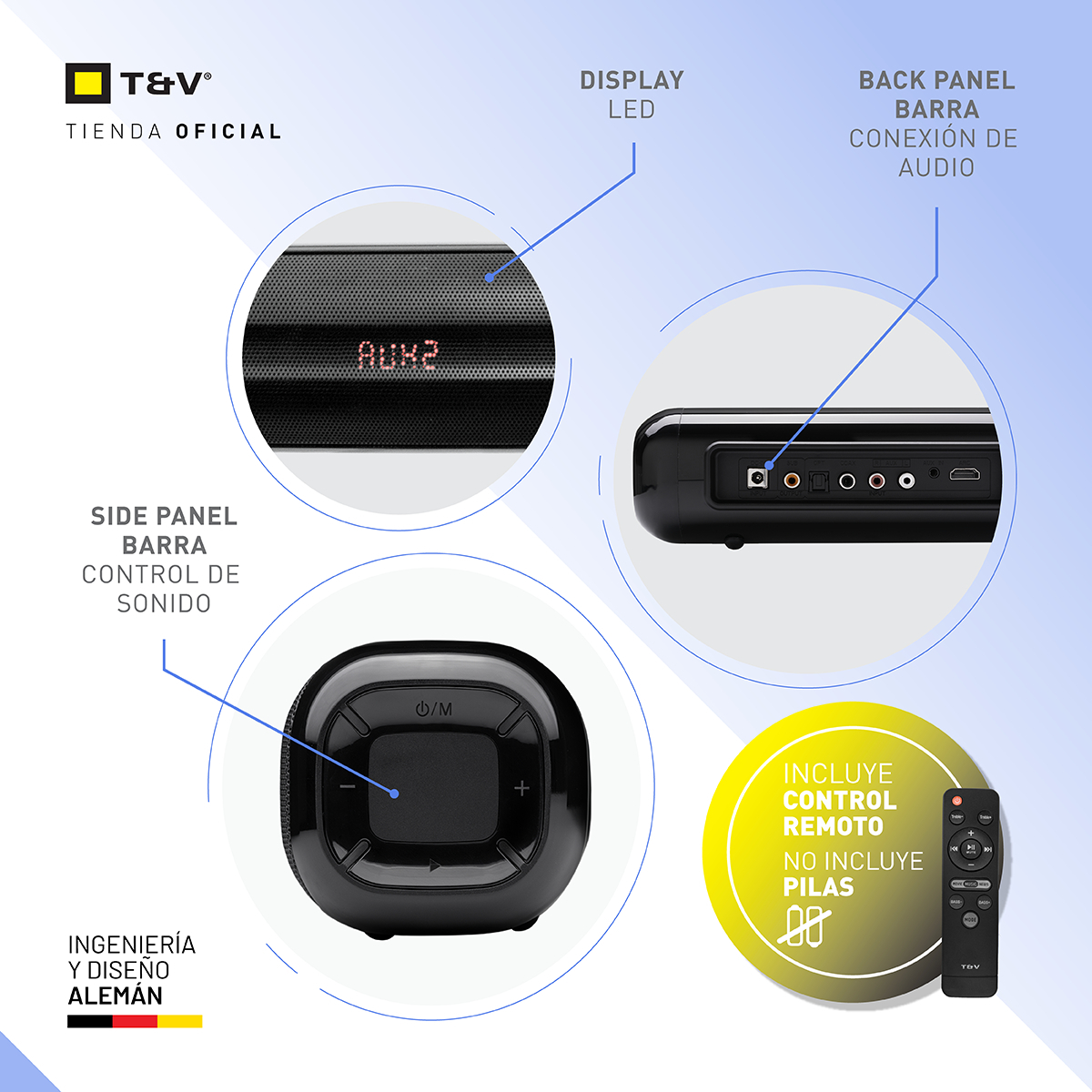 Conectividad: Bluetooth / AUX (miniplug 3.5 mm / RCA) – HDMI – Coaxial – Óptico