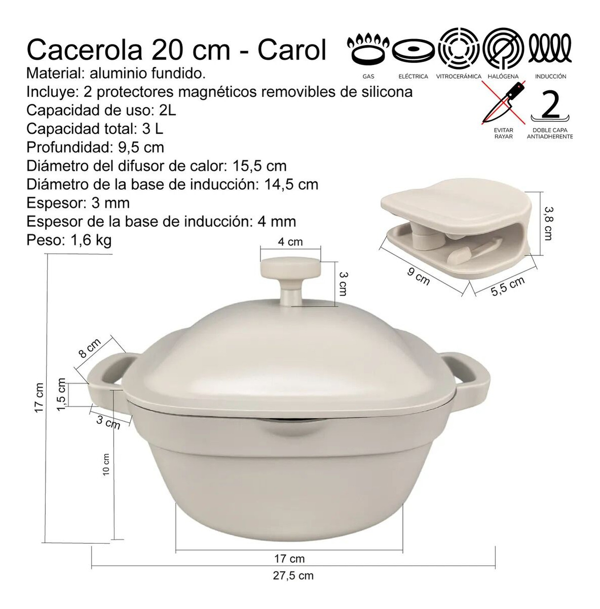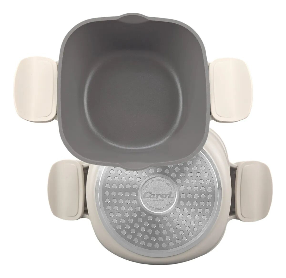 Nuestra cacerola está diseñada para proteger tus superficies gracias a sus protectores magnéticos removibles de silicona. Caracterizada por su gran conductividad térmica y su espesor base de 4mm, se convierte en una inversión a largo plazo para tu cocina. Cada detalle, desde su color tiza hasta su robusto diseño cuadrado, representa la calidad y refinamiento que Carol infunde en sus productos. Convierte cada reunión familiar o cena especial en una experiencia inolvidable con la herramienta perfecta para todo chef casero.