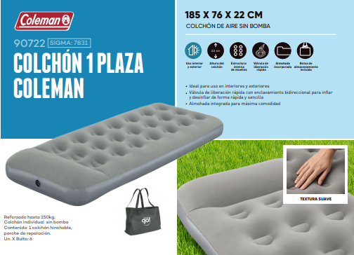 Con el colchón de 1 plaza Coleman, ya no tendrás que sacrificar el confort por la practicidad. Ideal para estudiantes en residencias, viajeros frecuentes o amantes del camping, se adapta a cualquier ocasión. No pierdas la oportunidad de transformar cualquier lugar en tu hogar temporal. ¡Invierte en tu descanso y bienestar hoy mismo!