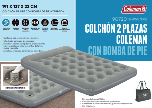 COLCHON 2 PLAZAS COLEMAN – C/ BOMBA DE PIE 191 X 137 X 22 CM