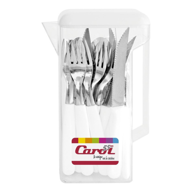 Juego de cubiertos 24 piezas compuesto por: 6 cuchillos de mesa filo laser, 6 tenedores de mesa, 6 cucharas de mesa, 6 cucharitas de mesa. Material: Acero inoxidable. Mango: Plástico. Incluye jarra de plástico cristal.