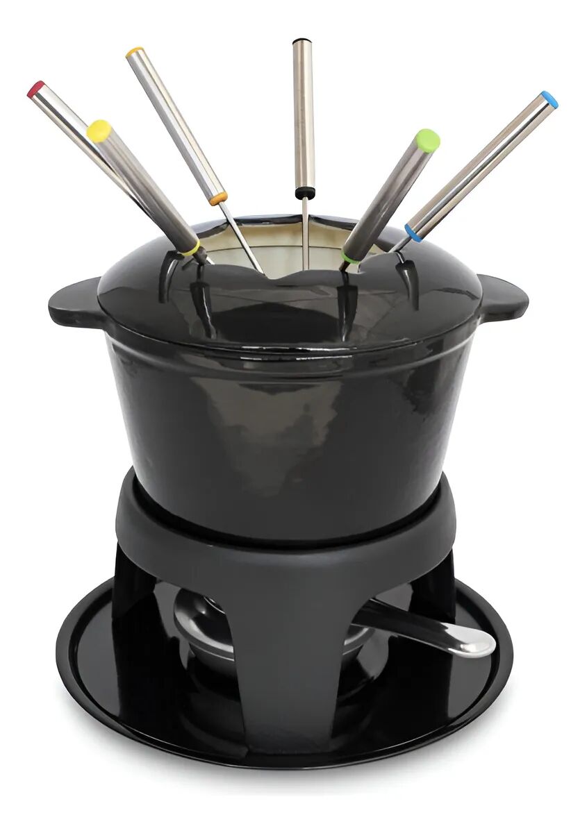 Este set es ideal para todas tus preparaciones favoritas, ya sea un clásico fondue de queso, una deliciosa mezcla de aceite y carne, o el irresistible fondue de chocolate para un postre memorable. Con su elegante diseño negro, es el complemento ideal para cualquier mesa, proporcionando un toque de clase y sofisticación para celebraciones familiares o cenas íntimas.