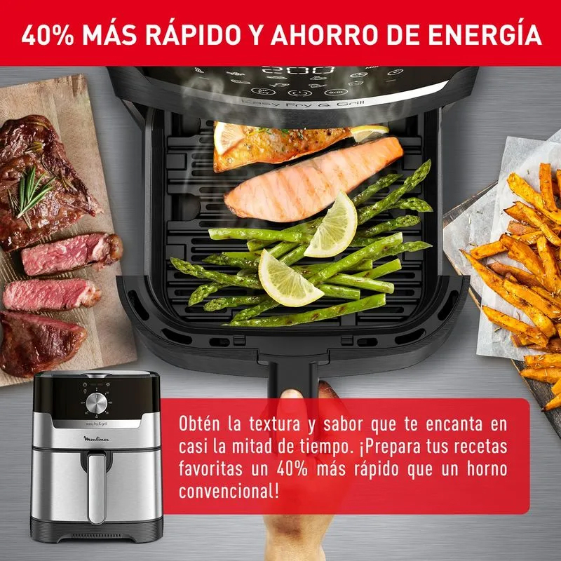 Además de freidora, cuenta con una parrilla y opción grill para cocinar carnes y verduras.