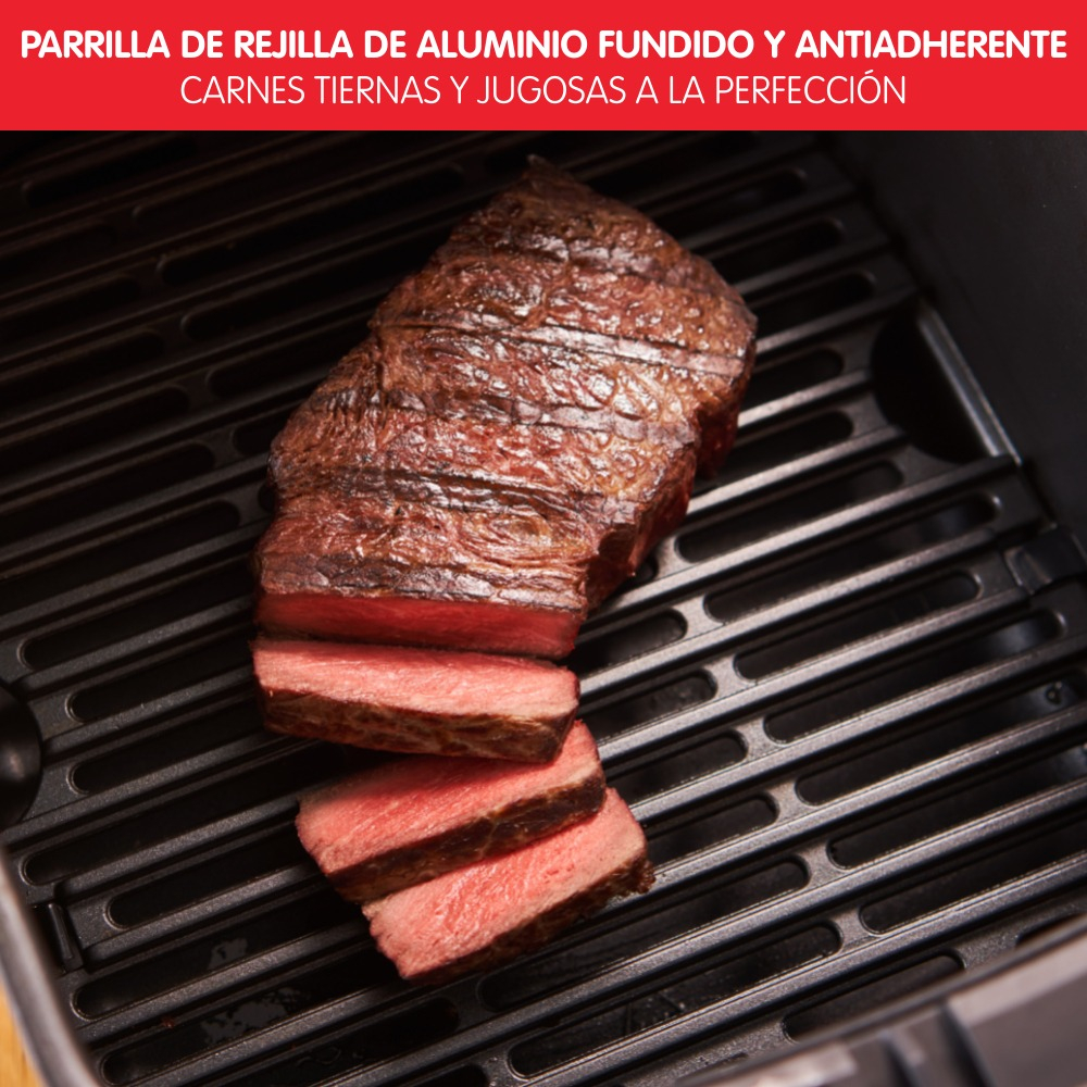 • Bowl extraíble con revestimiento antiadherente y rejilla de aluminio fundido para asar a la parrilla.