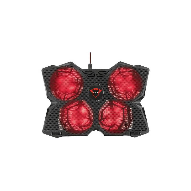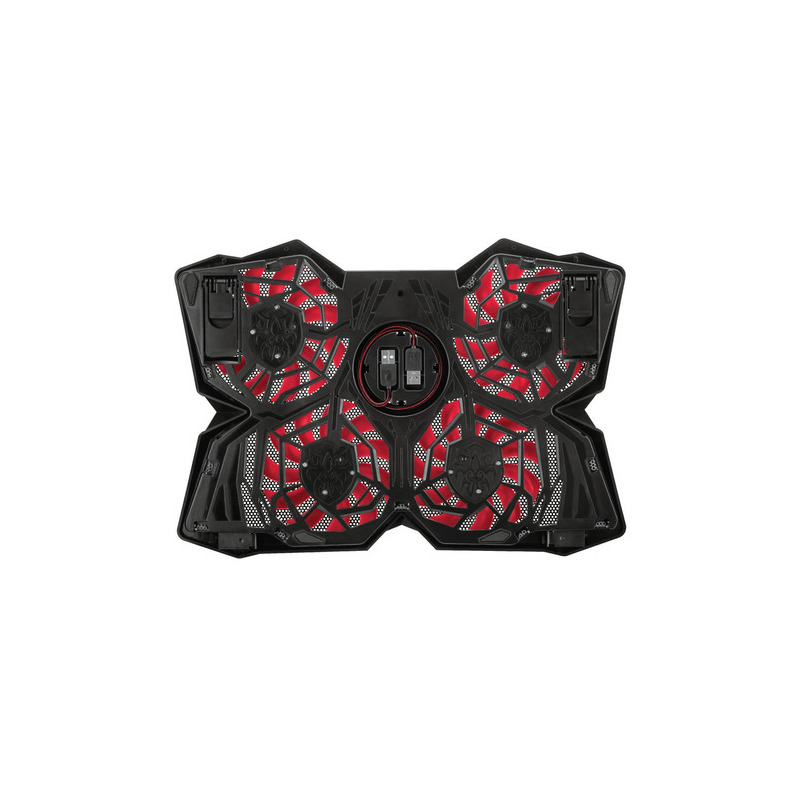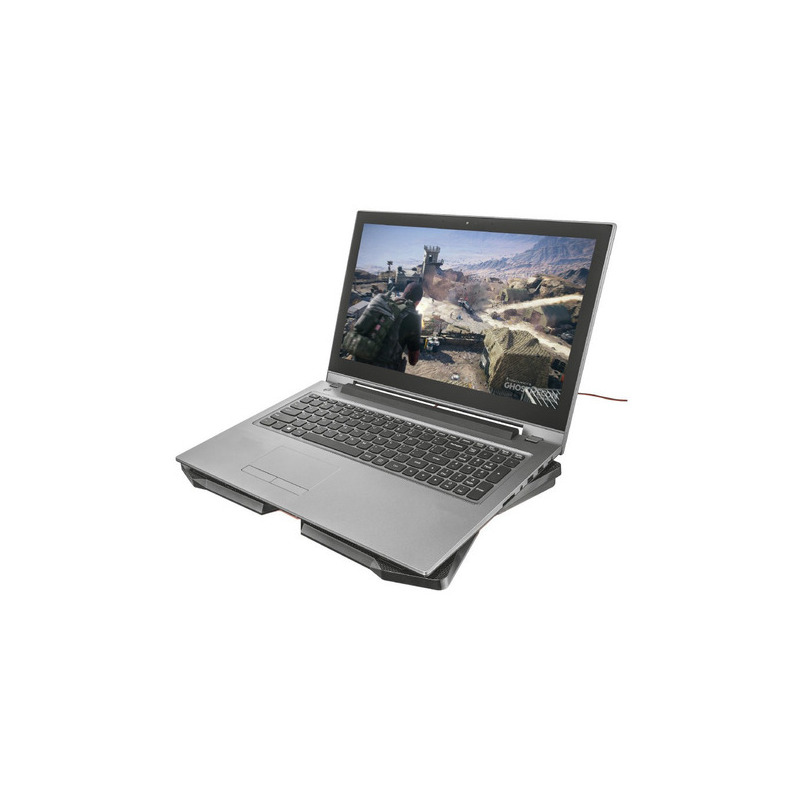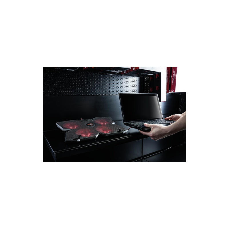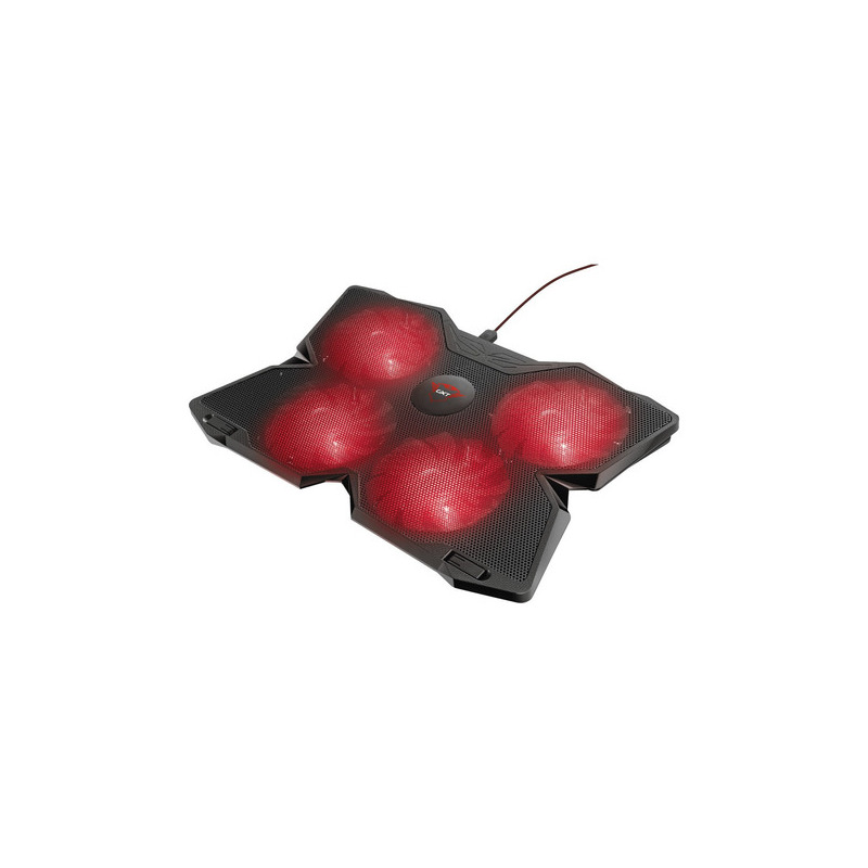 Soporte de refrigeración para ordenadores portátiles de juegos, equipado con 4 ventiladores iluminados, velocidad ajustable y una robusta carcasa. Adecuado para todos los ordenadores portátiles de hasta 17,3 pulgadas. Este soporte mantiene su ordenador portátil refrigerado para optimizar el rendimiento. Cuenta con altura ajustable en tres posiciones para la mayor comodidad. Los 4 ventiladores, iluminados en rojo, proporcionan un flujo de aire óptimo. La velocidad de los ventiladores es ajustable e incluso pueden desactivarse completamente. Incluye almacenamiento del cable integrado para un transporte sencillo.