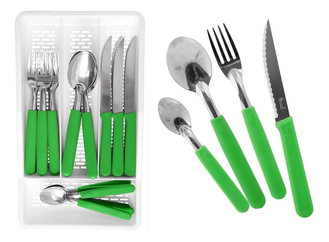 Este juego de cubiertos de 24 piezas en cubiertera Carol 41024 es ideal para cualquier hogar. Incluye una cubiertera plástica blanca con 4 divisiones, con medidas de 33,2 cm de largo y 18,5 cm de ancho, que facilita la organización. El set contiene 6 cuchillos, 6 tenedores, 6 cucharas de mesa y 6 cucharas de té, todos con mangos de plástico y hojas de acero inoxidable, garantizando durabilidad y resistencia. Además, es apto para lavavajillas, lo que simplifica su limpieza. Este kit de fábrica, de la reconocida marca Carol, es nuevo y no tiene fecha de vencimiento, asegurando una larga vida útil.