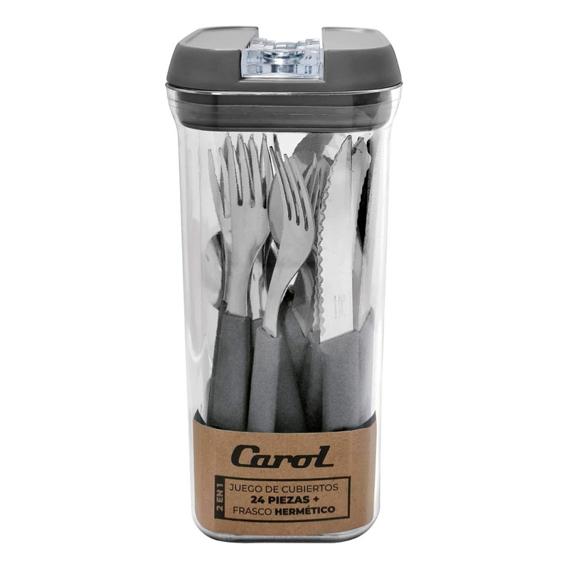 Este juego de cubiertos no solo es práctico para el uso diario, sino que también es perfecto para ocasiones especiales, brindando a tus invitados una experiencia culinaria inolvidable. La presentación en frasco hermético no solo protege y organiza tus cubiertos, sino que también sirve como un elemento decorativo en tu cocina o comedor. Haz que cada comida sea una muestra de tu buen gusto y atención al detalle con este juego de cubiertos Carol.