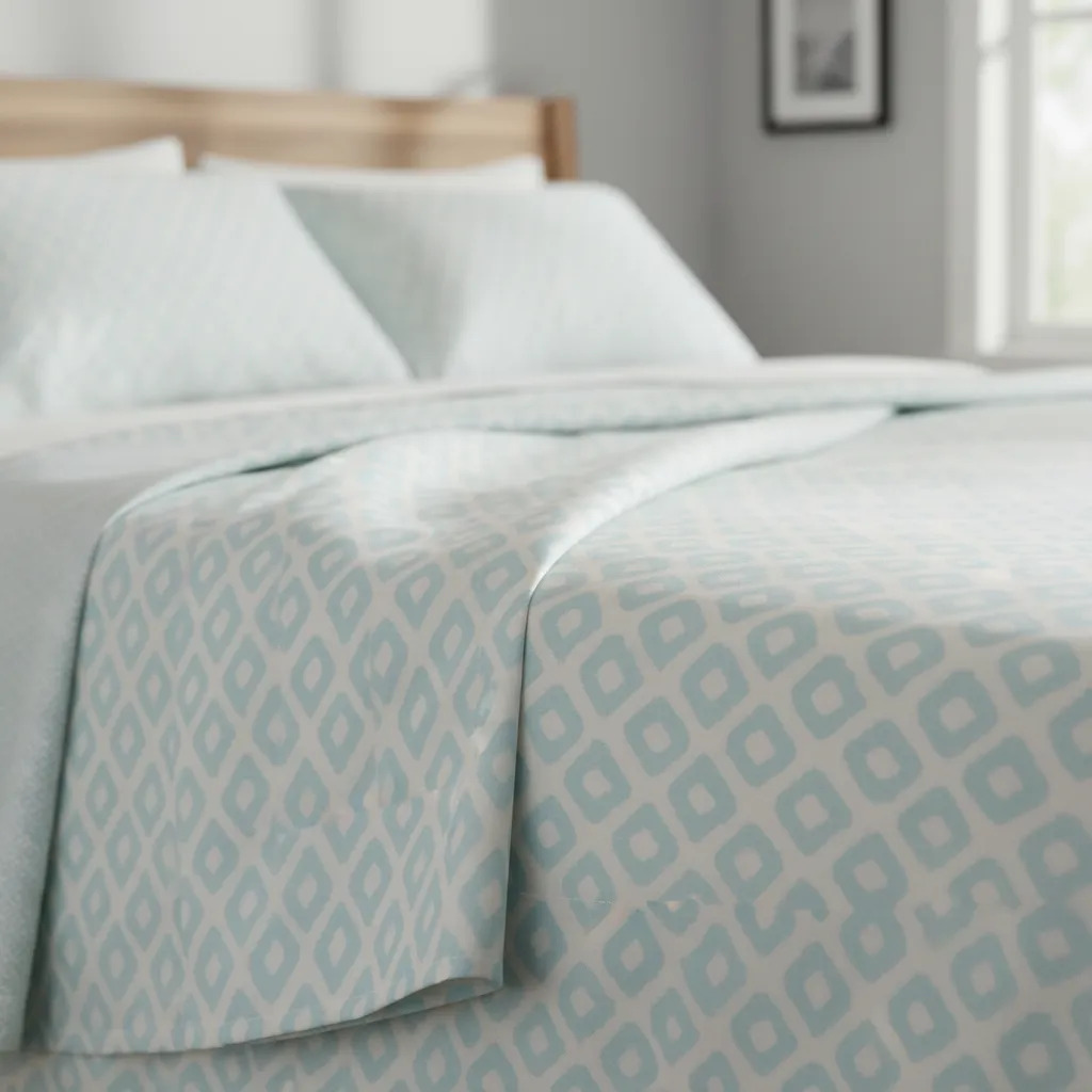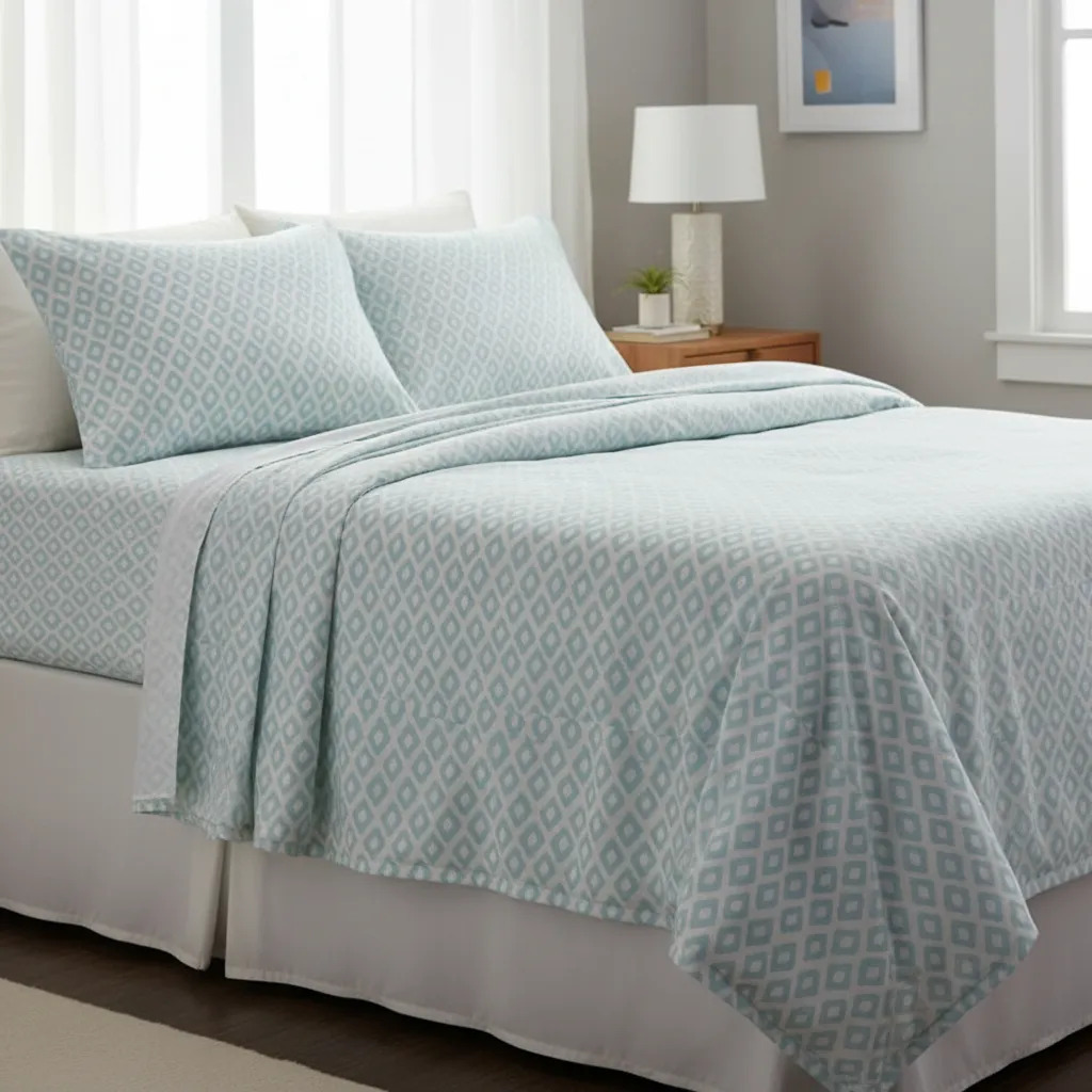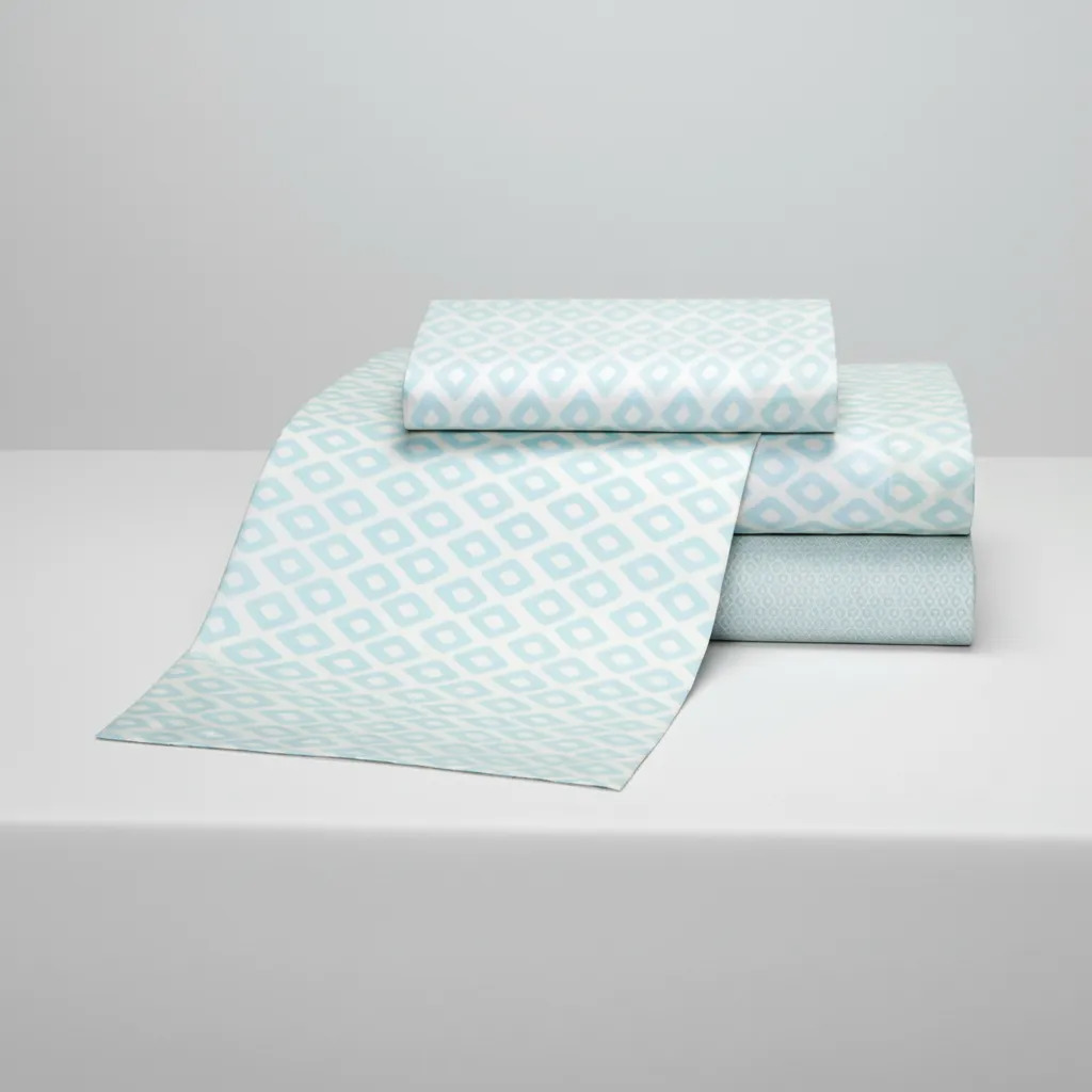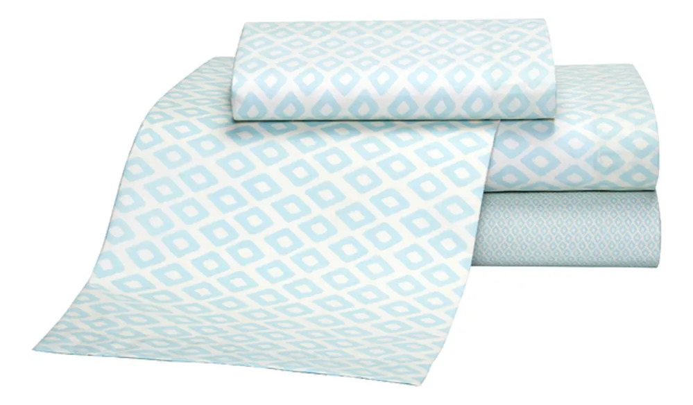 - Mejora la estética del dormitorio: el color Agua y el estampado Diamond ayudan a crear un ambiente luminoso y relajante.