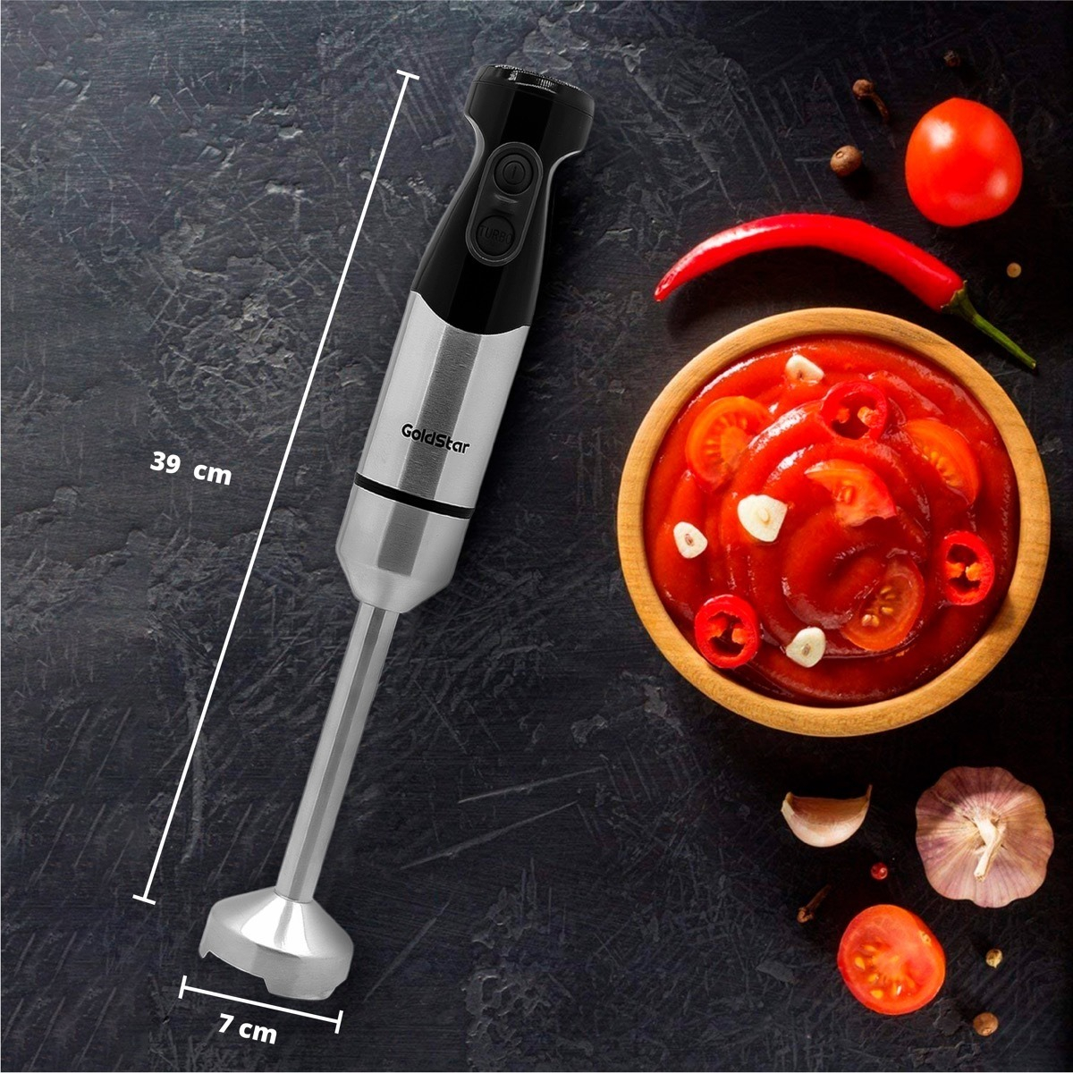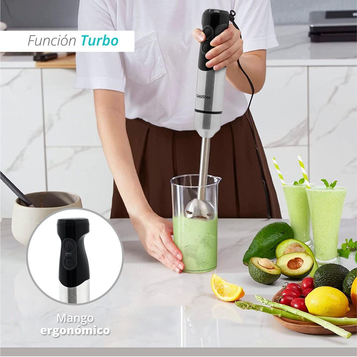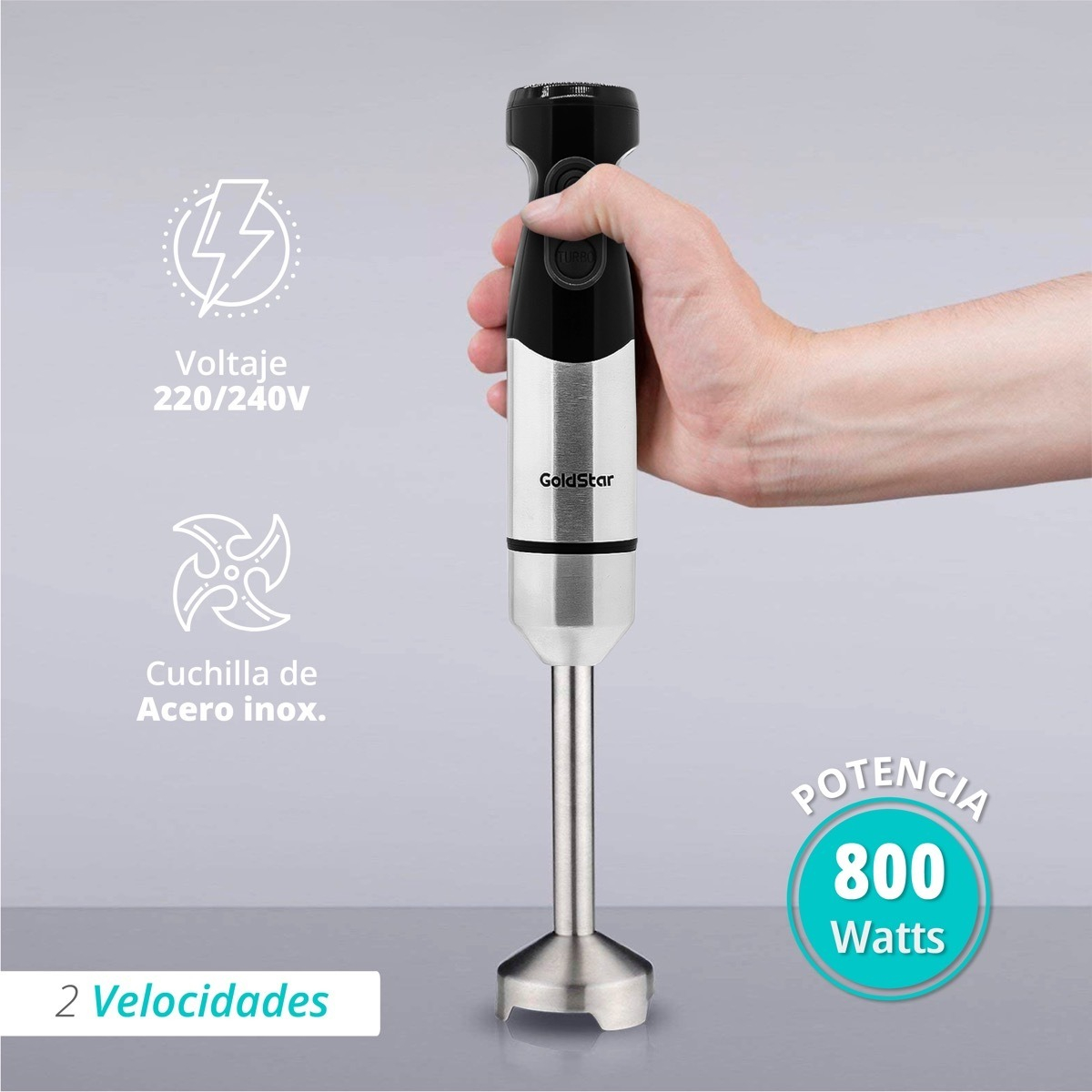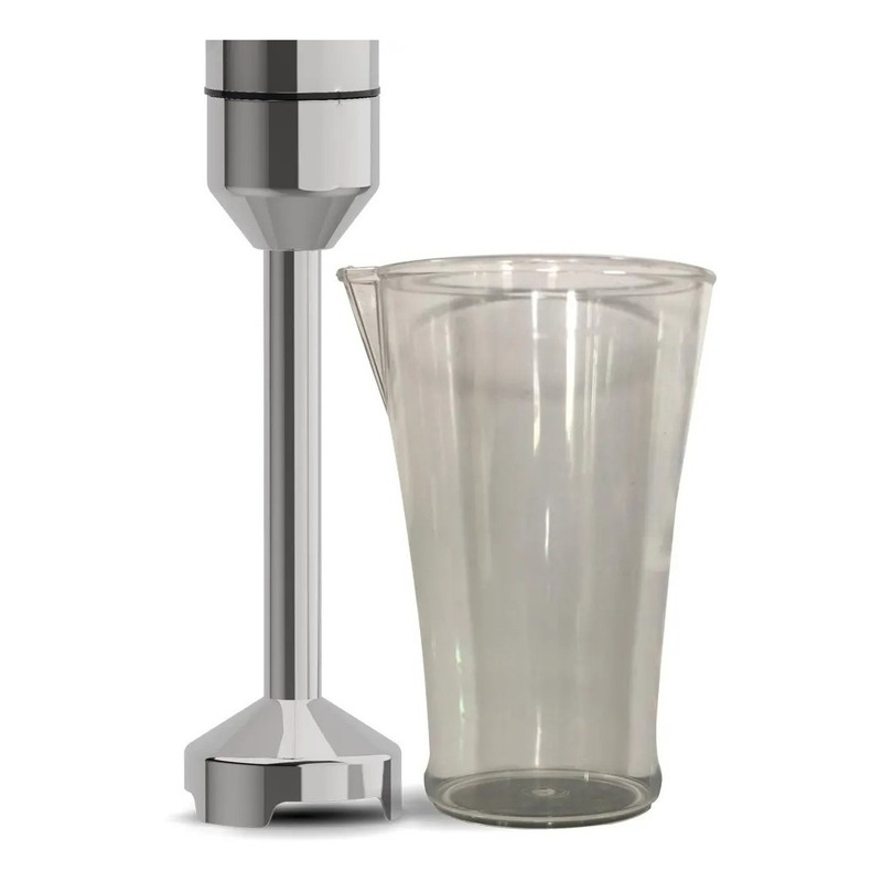 Licuadora de mano con varilla desmontable que facilita su limpieza. Potente motor de 800 Watts con FUNCIÓN TURBO. Elegante cuerpo de acero inoxidable y vaso mezclador de acrílico.