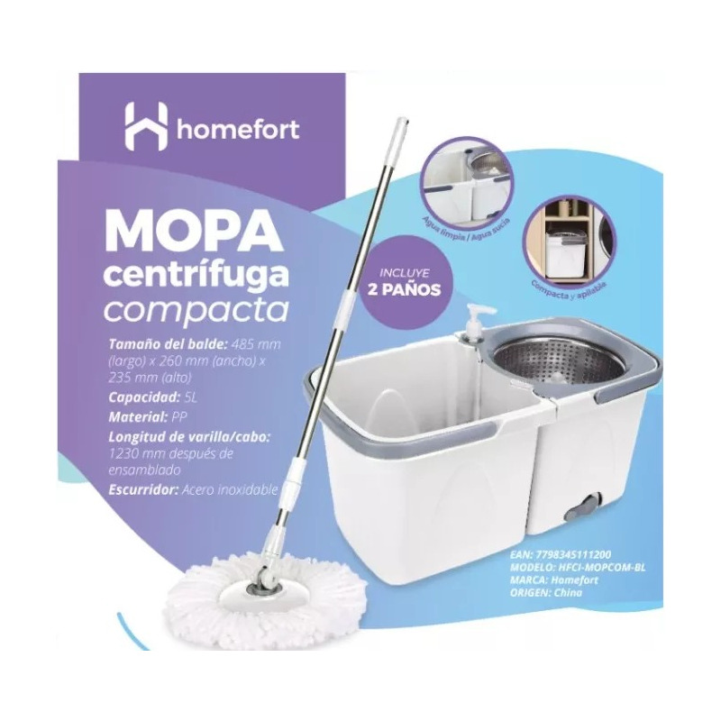 El Mopa Centrifuga 5l. Escurridor Acero Y Dispenser De Líquidos de la marca HOMEFORT es el aliado perfecto para mantener tus pisos impecables. Con su material de trapo de algodón y mango de aluminio, garantiza una limpieza eficiente y duradera. Además, incluye un lampazo de repuesto y un balde centrifugador, para que siempre tengas a mano todo lo necesario para una limpieza completa. Su balde centrifugador de plástico cuenta con rotación de 360 grados, lo que facilita el escurrido del trapo y ahorra tiempo en el proceso de limpieza. El mango regulable y el cabezal giratorio del lampazo de limpieza permiten llegar a todos los rincones de tu hogar.
