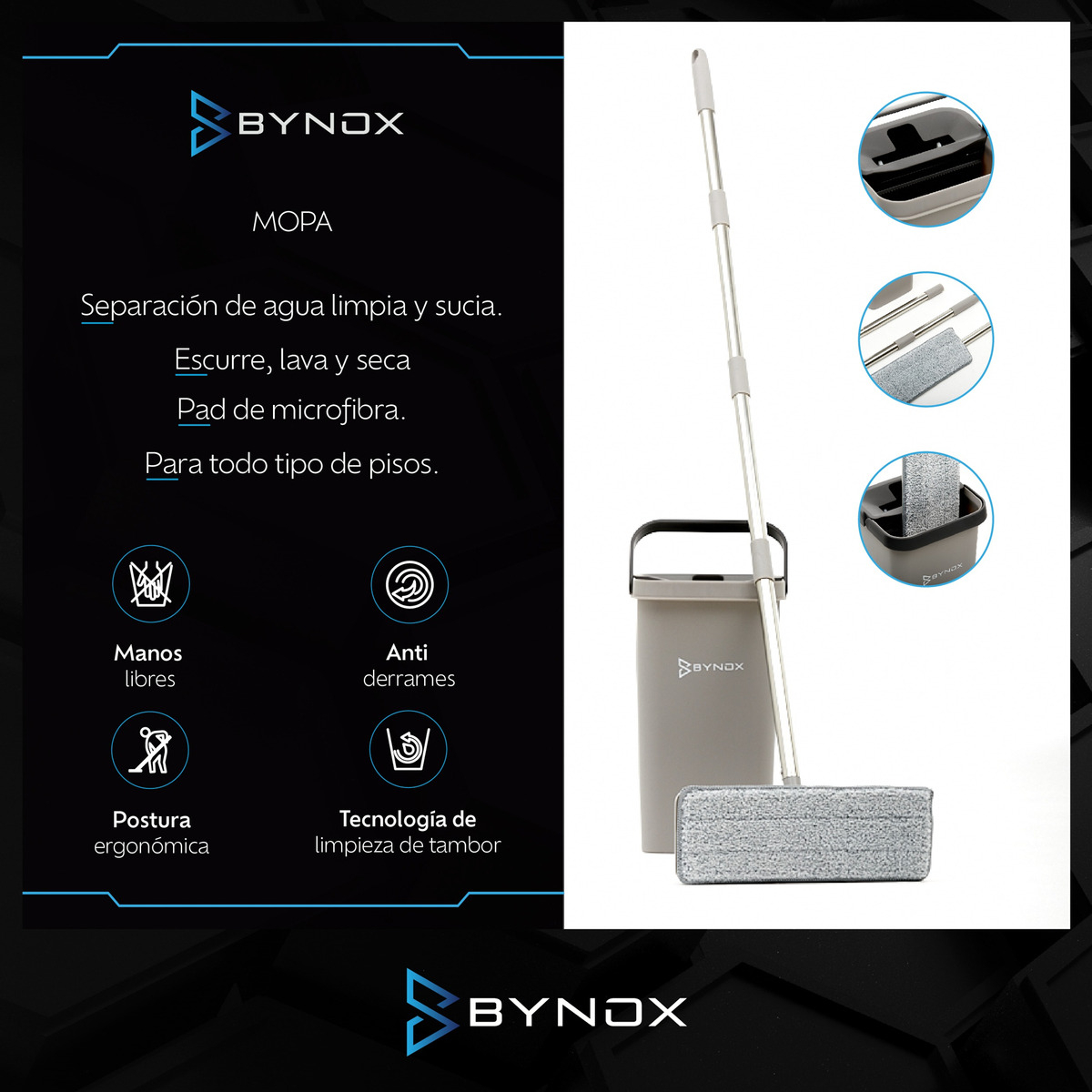 La Mopa Trapeadora Plana BYNOX combina estilo, innovación y rendimiento, haciendo de la limpieza una tarea más sencilla y eficaz.