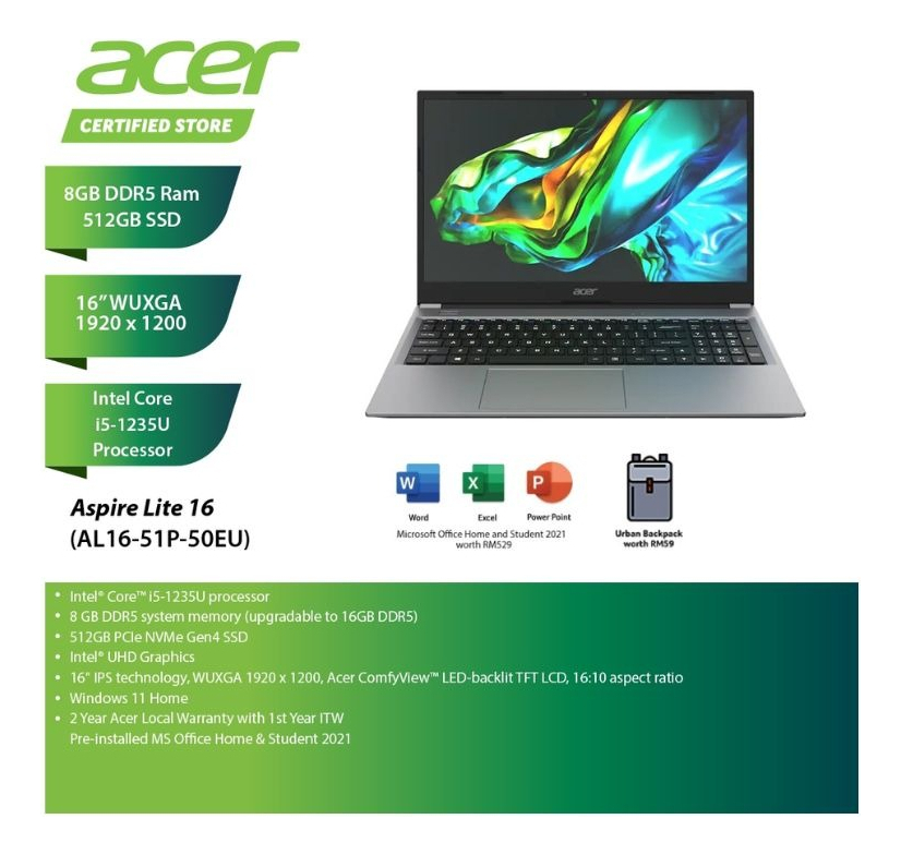 La notebook Acer Aspire Lite AL16-51P-59UU-ES es una opción potente y versátil para diversas necesidades. A continuación, se detallan sus principales características: