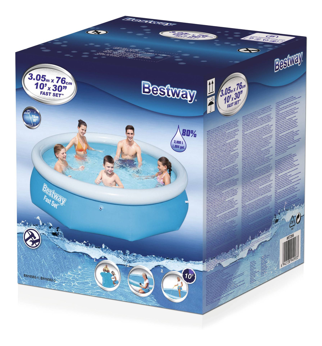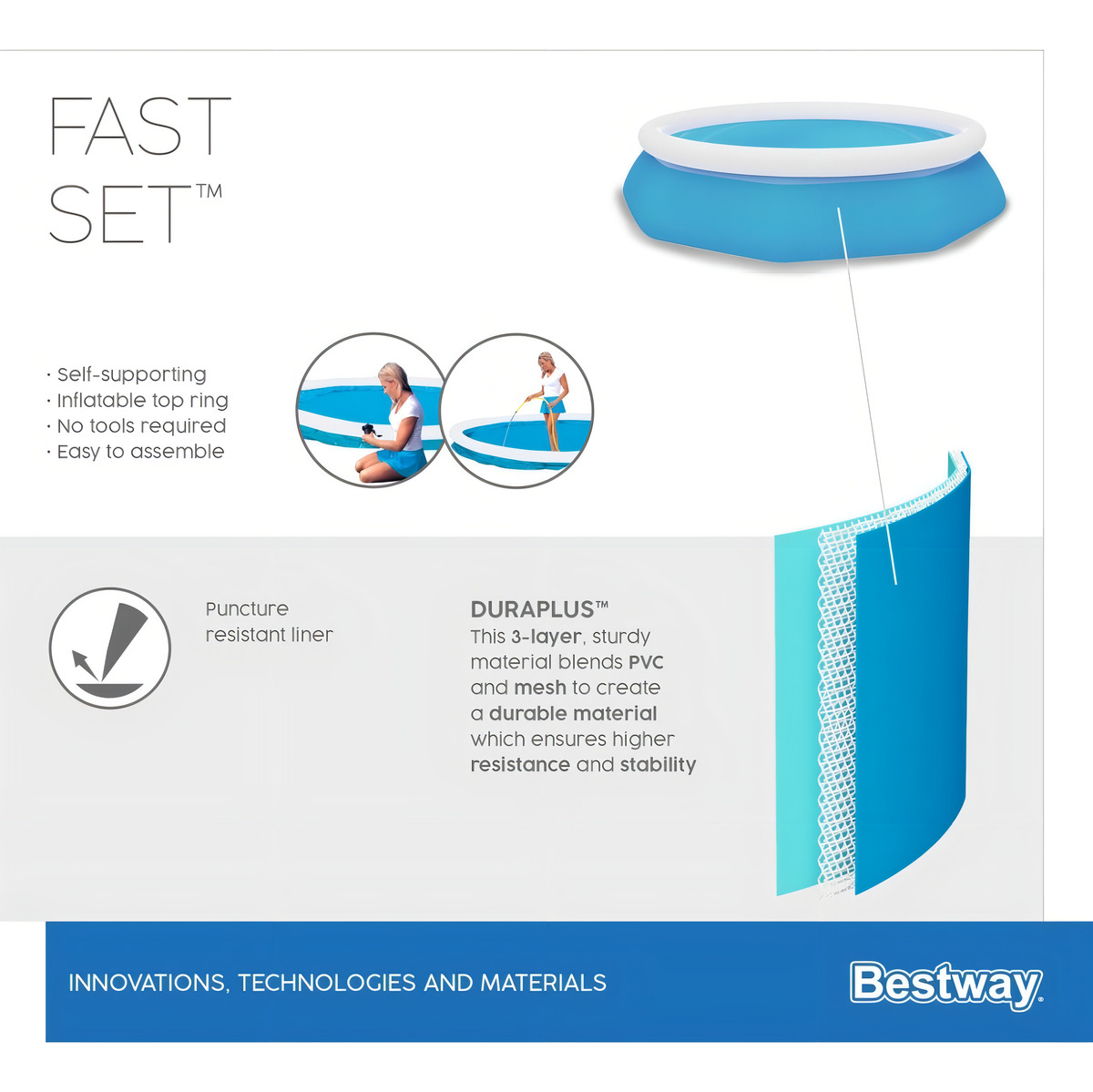 La línea Fast Set de Bestway es de armado rápido, para que en pocos minutos puedas refrescarte en tu nueva pileta.