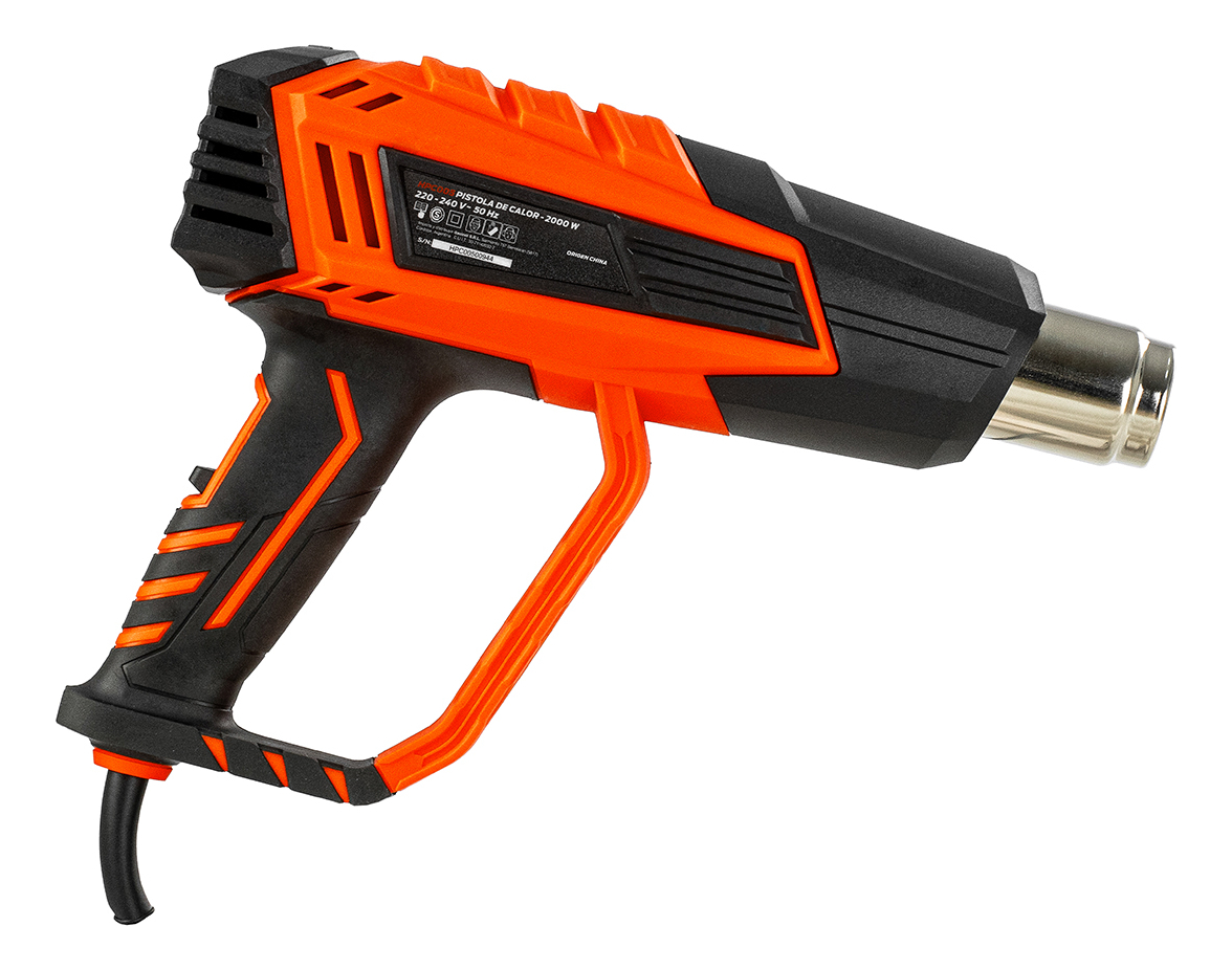 Pistola de calor de alta performance, con una potencia de 2000w, 2 niveles de temperatura, 360°c y 600°c, incluye boquilla de acero inoxidable y mango antideslizante.