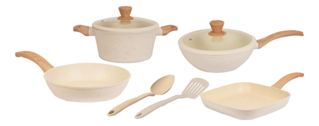 El set de batería Carol de 8 piezas con espátulas de nylon de la línea Granito Beige (51008) es una solución completa para tu cocina, combinando elegancia y funcionalidad. Este versátil conjunto incluye una cacerola de 24 cm, un wok de 26 cm con tapa, una sartén de 26 cm, y una bifera de 27 cm. Cada pieza está diseñada con un acabado Granito Beige que no solo añade un toque moderno, sino que también ofrece una superficie antiadherente para una cocción y limpieza sin complicaciones. Además, el set incluye una espátula y una cuchara de guiso de nylon, ideales para mantener las superficies antiadherentes en óptimas condiciones. Todo el conjunto está cuidadosamente empaquetado en una caja de cartón corrugado, proporcionando una protección adecuada durante el transporte y almacenamiento. Este set es perfecto para quienes buscan versatilidad y estilo en sus utensilios de cocina.