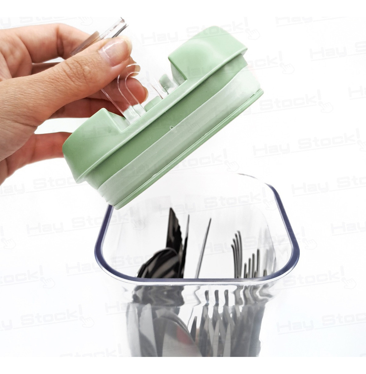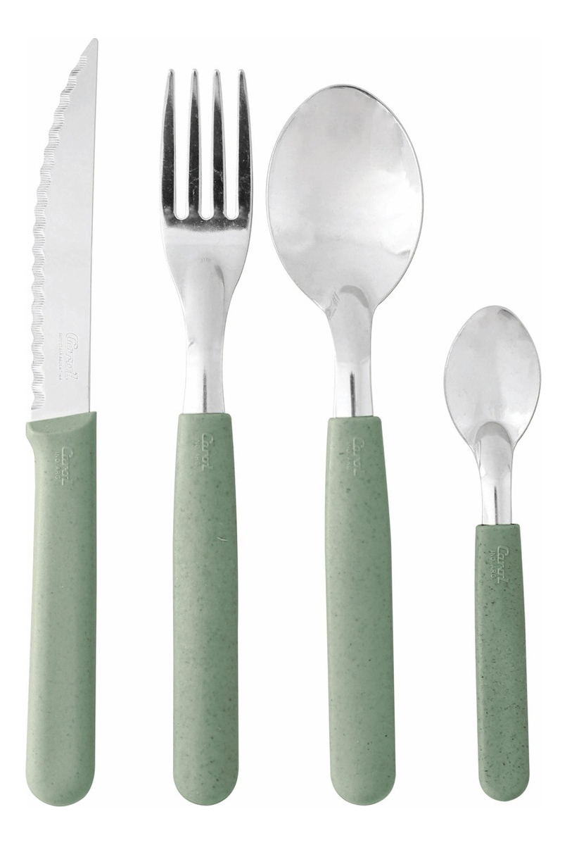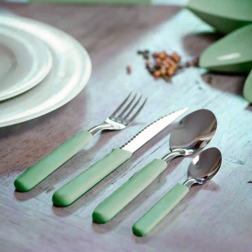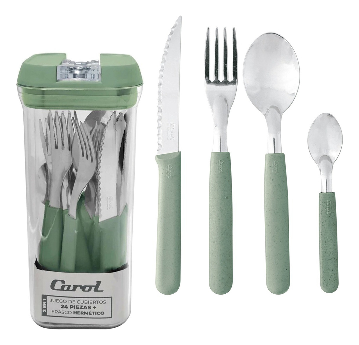 Juego de cubiertos x 24 piezas de acero inoxidable con mango de plástico sustentable, más frasco hermético transparente con traba.