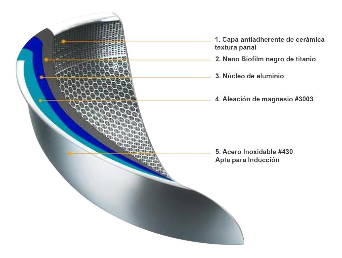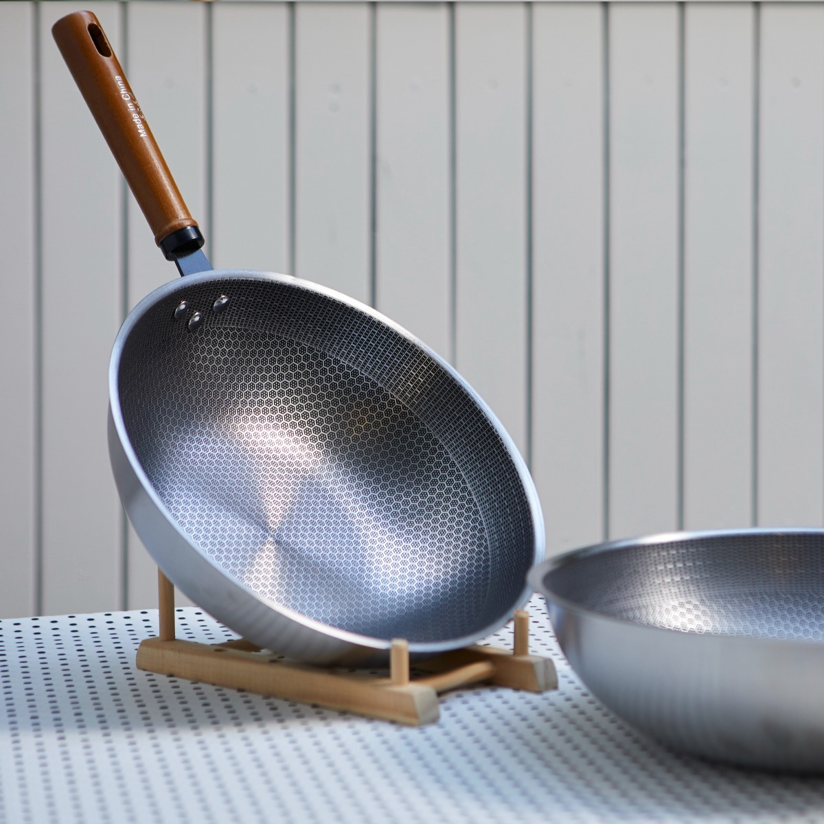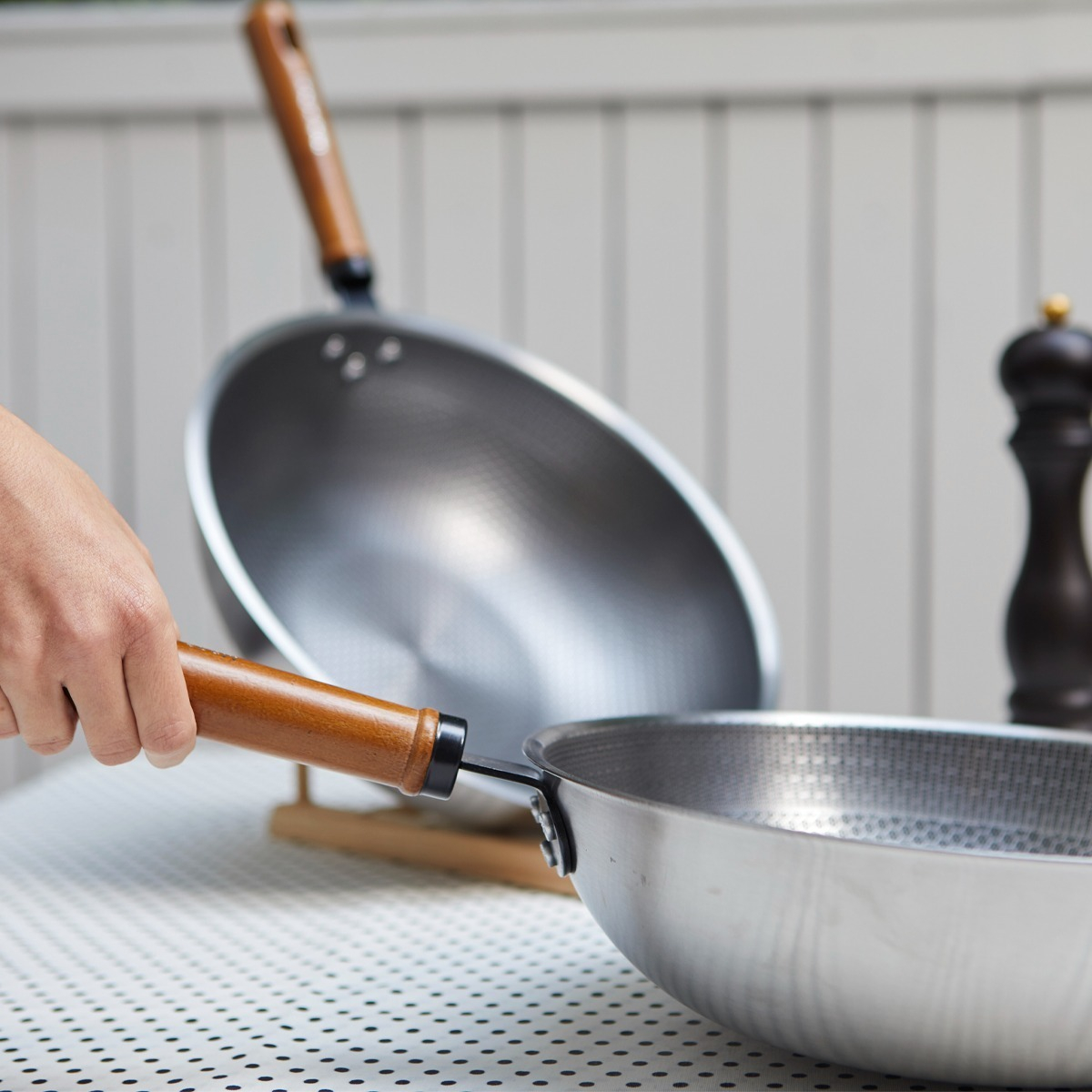 Wok de acero con mango de madera, 5 capas, apto para todo tipo de hornos. Cocina más saludable con menos aceite.